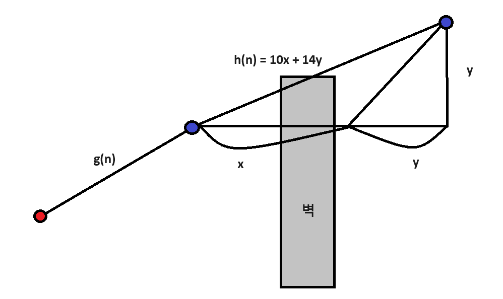 총 예상 비용 f(n) = 시작점 부터 해당 위치까지의 거리 g(n) + 목적지까지 거리의 추정치 h(n)