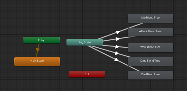 적의 Animator 입니다. 블랜더를 위한 float X, Y를 제외하고 나머지 애니메이션 제어를 위한 파라미터는 전부 bool로 뒀습니다.