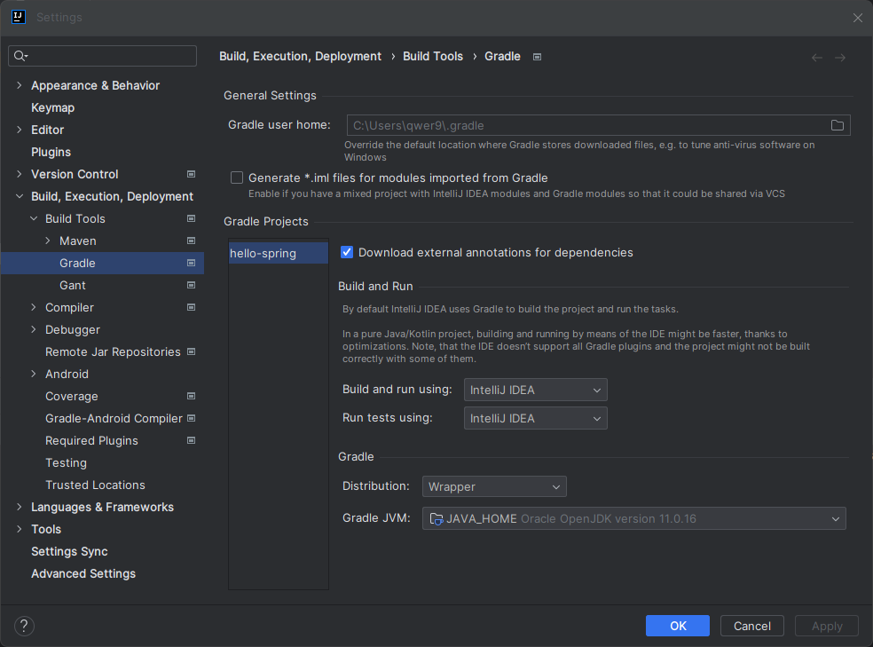 - Build and run using과 Run tests using을 Gradle(Default)에서, IntelliJ IDEA로 변경