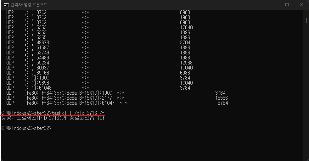 포트가 죽지 않고 PID가 변경된 경우, Solution_01에서 진행한 과정과 동일하게 taskkill /pid (PID) /f 명령어를 통해 포트를 죽여 문제를 해결할 수 있다.