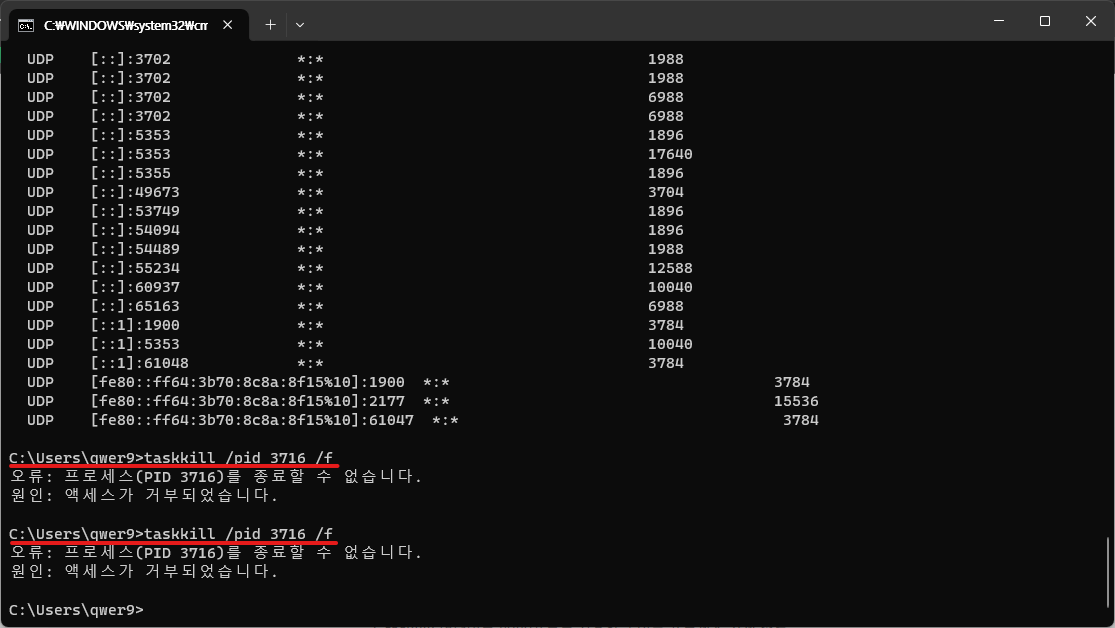 이번에는 아래와 같이 포트를 죽이려고 할 때 액세스가 거부되어 종료할 수 없는 경우를 해결해보고자 한다.