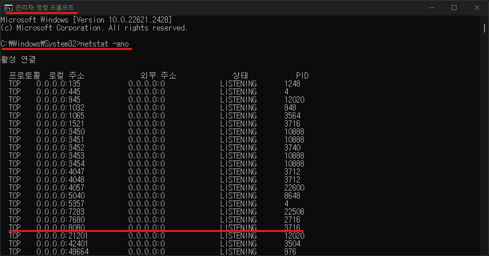 관리자 권한으로 실행한 명령 프롬프트에 _netstat -ano 명령어를 입력하여 PID를 확인하였다.