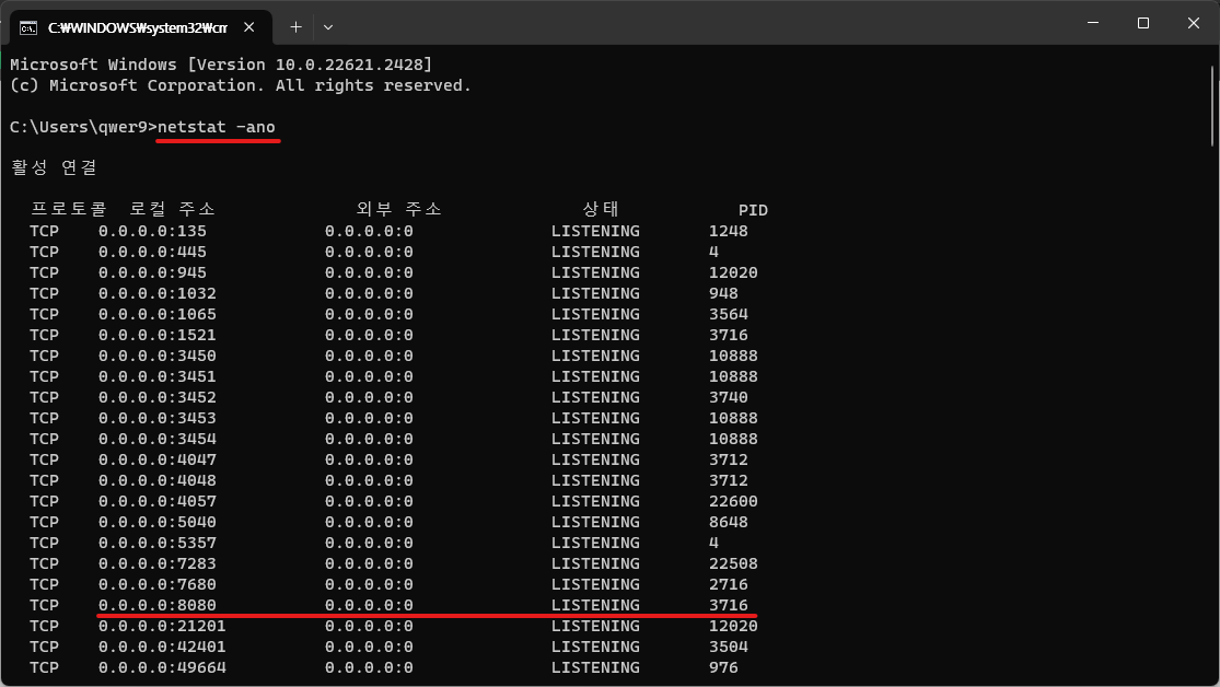 - netstat -ano 명령어를 입력하여 현재 내PC에서 사용중인 포트를 확인