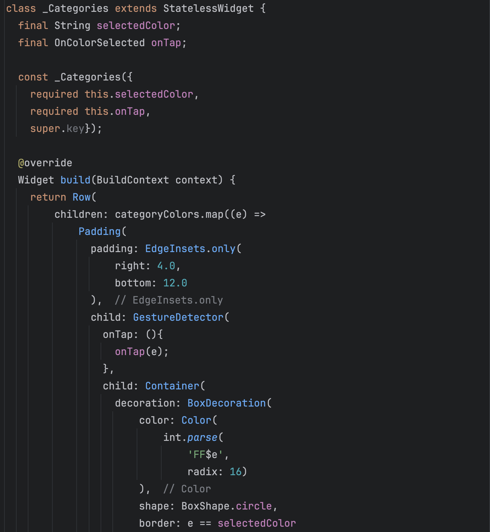 사용자가 categoryColors 중 색깔을 선택하면 onTap: onTap(e)가 호출되고,