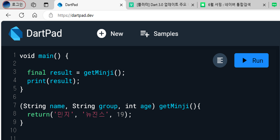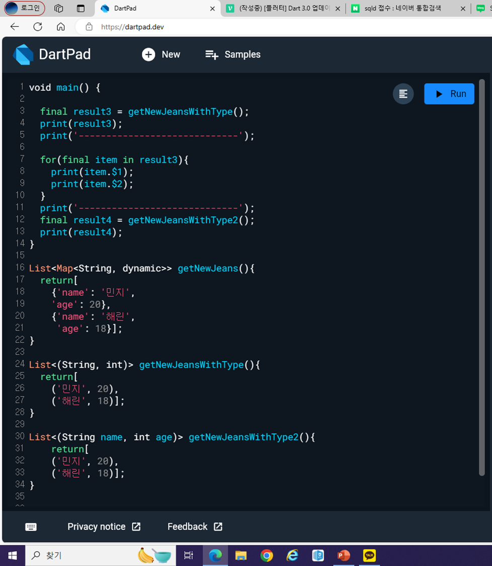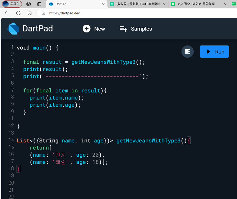 List 안에 Map을 넣으면 dynamic 값을 쓸 수 밖에 없다. 왜냐하면 'name' : '민지' 'age':20 처럼 뒤에 '민지'가 들어갈 수도 있고 20이 들어갈 수도 있기 때문이다.