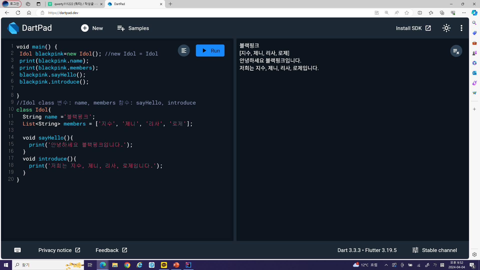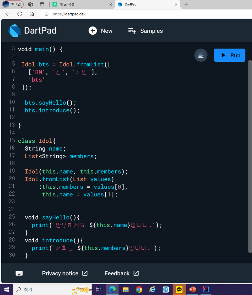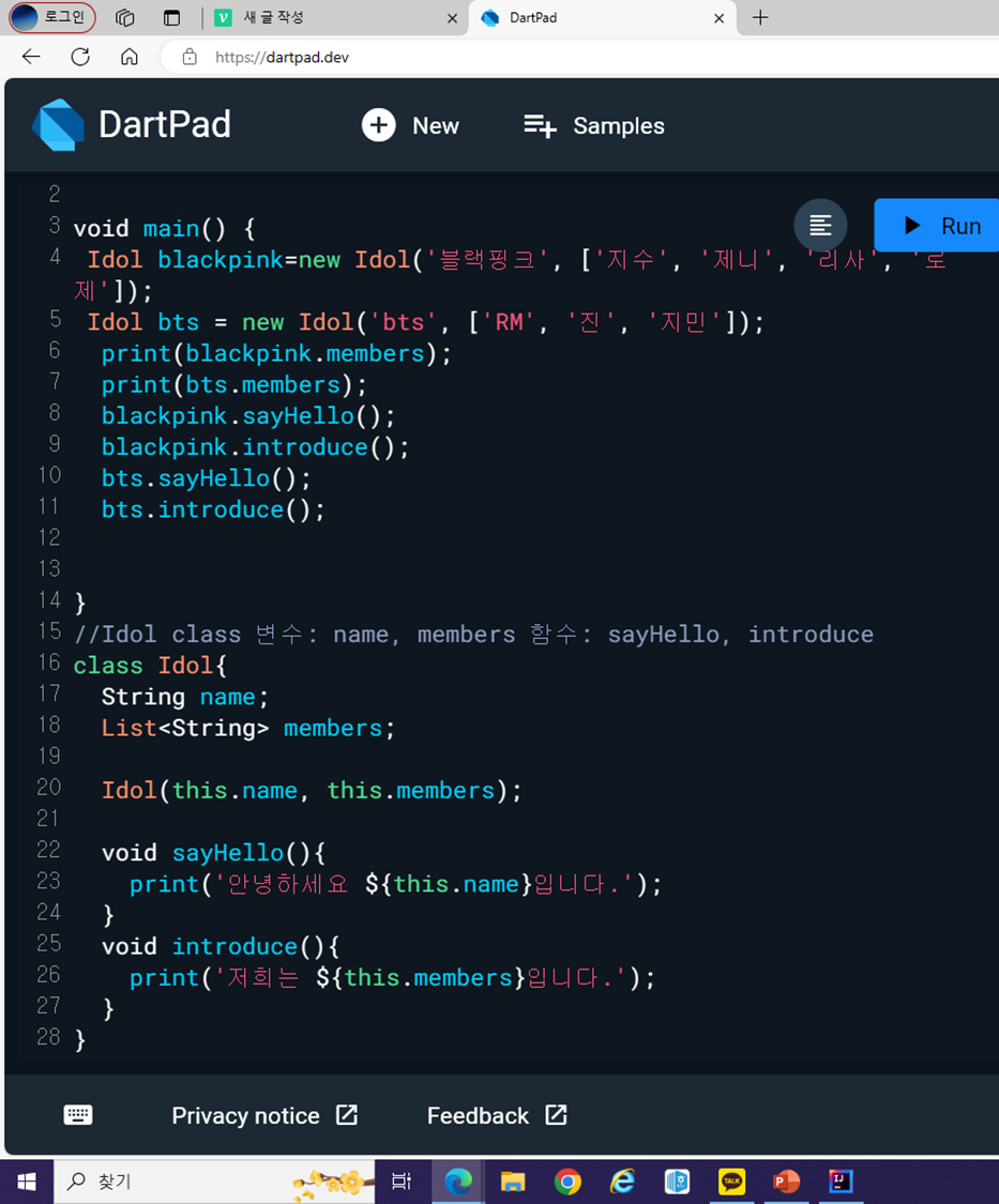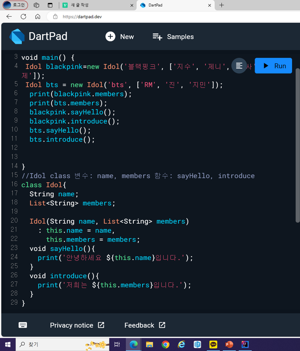 Idol blackpink2 = Idol('블랙핑크', ['제니', '지수', '리사', '로제];
