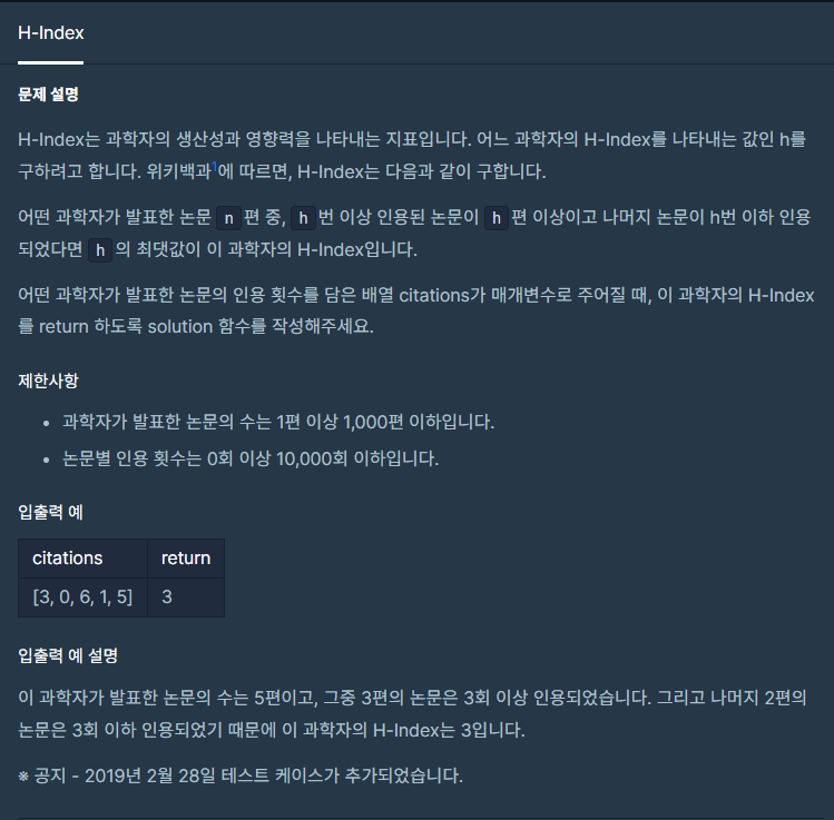 - citations의 길이가 1000이하이기 때문에 O(n2)으로 풀어도 시간초과가 나지 않습니다.