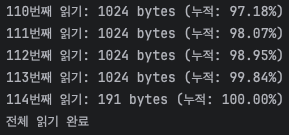 System.out.printf("%03d번째 읽기: %d bytes (누적: %.2f%%) \n",