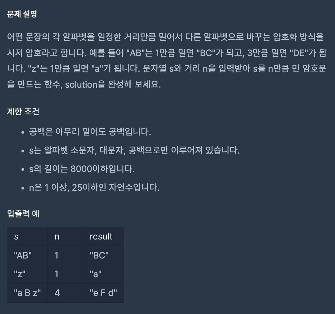 어떤 문장의 각 알파벳을 일정한 거리만큼 밀어서 다른 알파벳으로 바꾸는 암호화 방식을 시저 암호라고 합니다. 예를 들어 "AB"는 1만큼 밀면 "BC"가 되고, 3만큼 밀면 "DE"가 됩니다. "z"는 1만큼 밀면 "a"가 됩니다. 문자열 s와 거리 n을 입력받아 s를 n만큼 민 암호문을 만드는 함수, solution을 완성해 보세요.