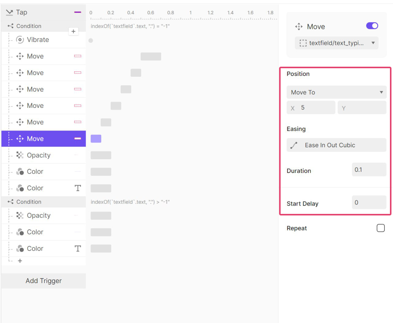 오른쪽으로 100ms 동안 5px 이동 후 원래 위치로 돌아온 뒤