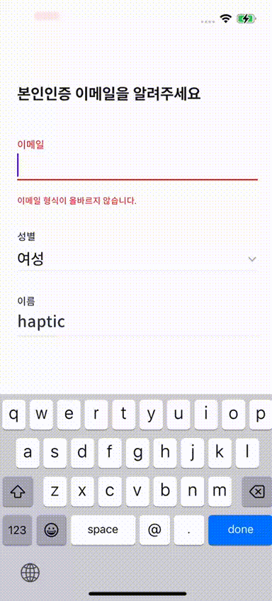 이메일 형식이 아니라는 문구와 함께 햅틱 피드백