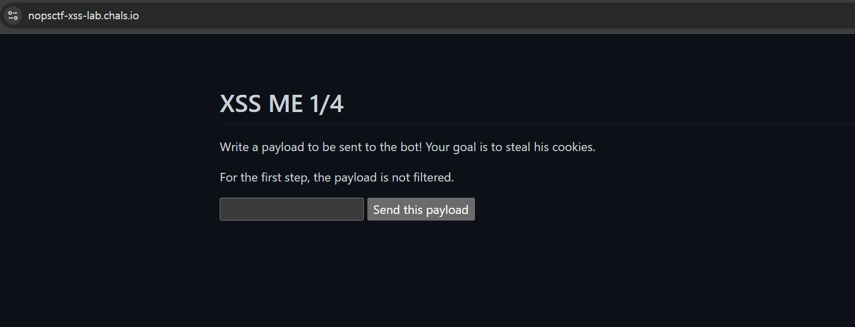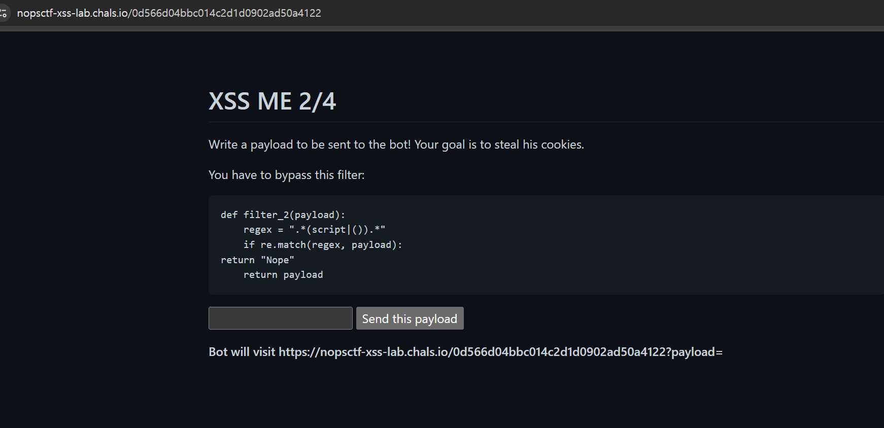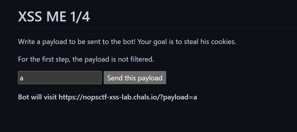 아무 말이나 쳐 봤더니 이런 메시지가 뜬다. 입력한 페이로드가 URL 파라미터로 전달되어 봇이 해당 페이지를 방문하는 구조인 듯 싶다.