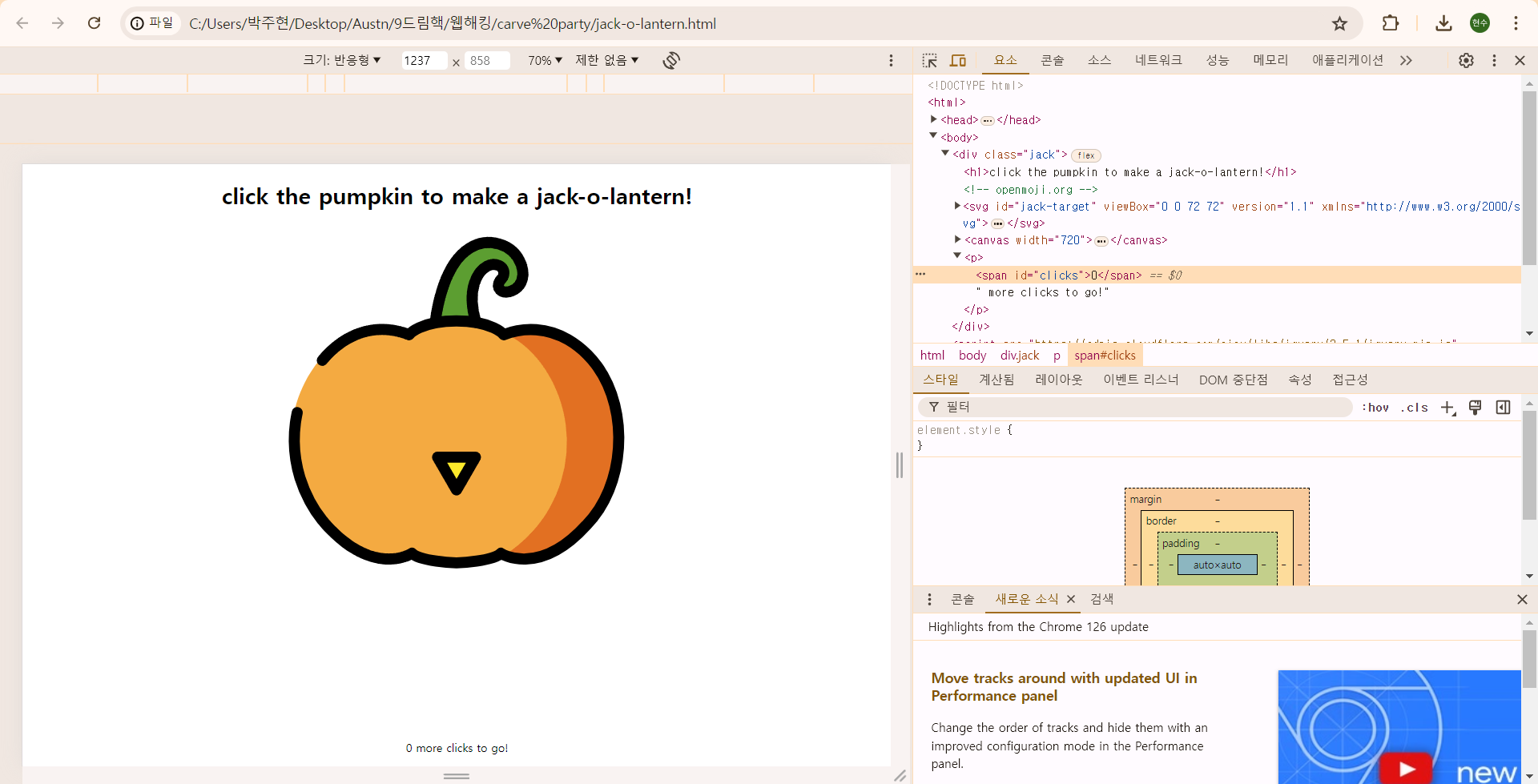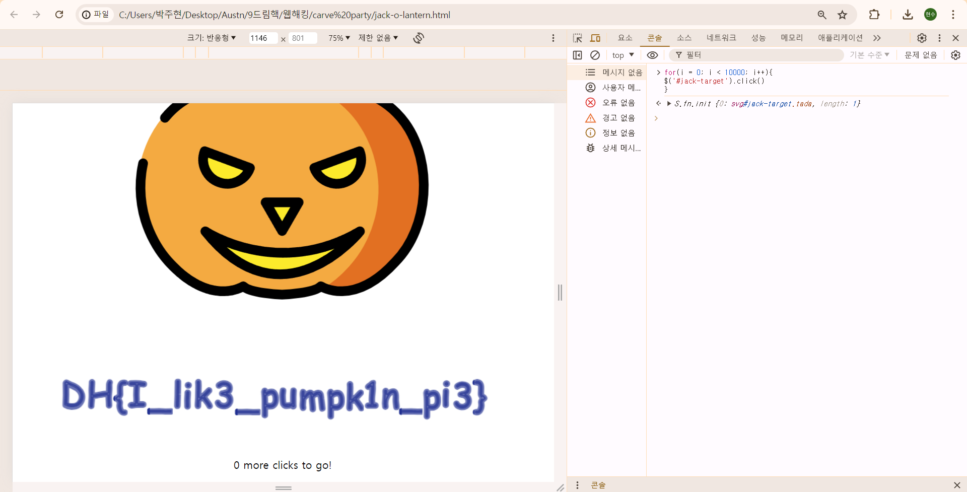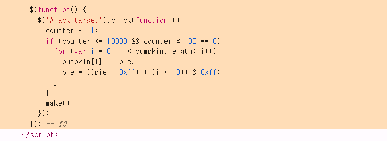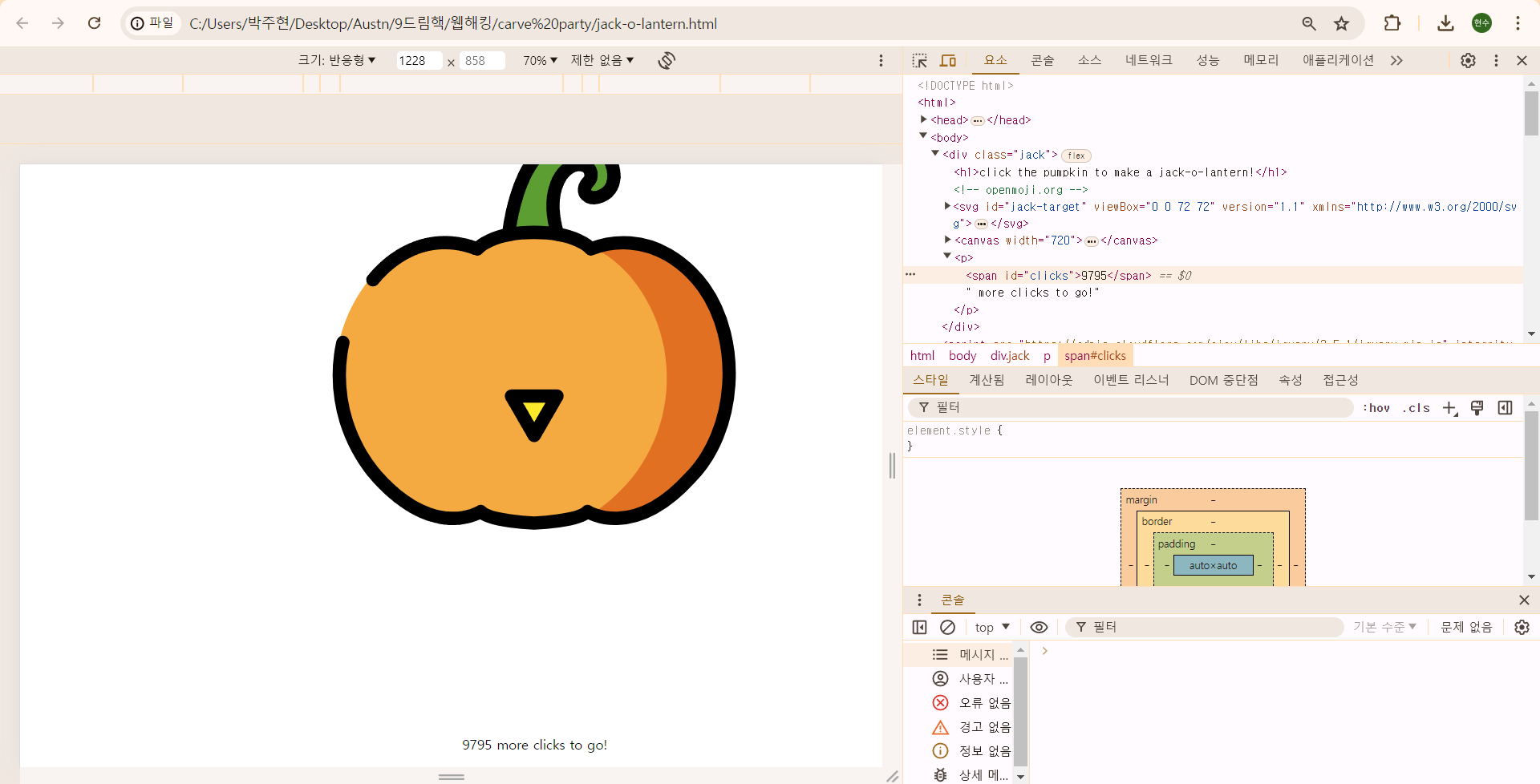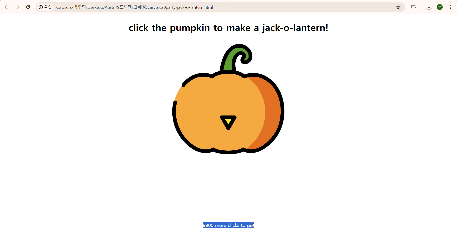 클릭 횟수에 따라 호박의 입술 색이 바뀐 걸로 봐서는 웹 프로그래밍 시간에 배운 자바 스크립트 효과가 들어간 것 같다.