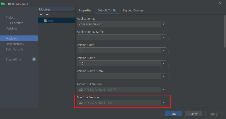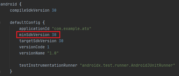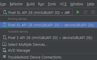 minSdk(API 30) > deviceSdk(API 28) 이런식으로 떠있다