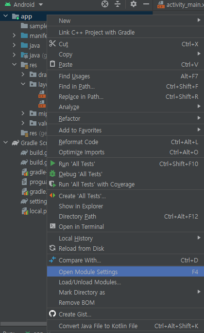 app 마우스 우클릭해서 Open Module Settings에 들어간 뒤