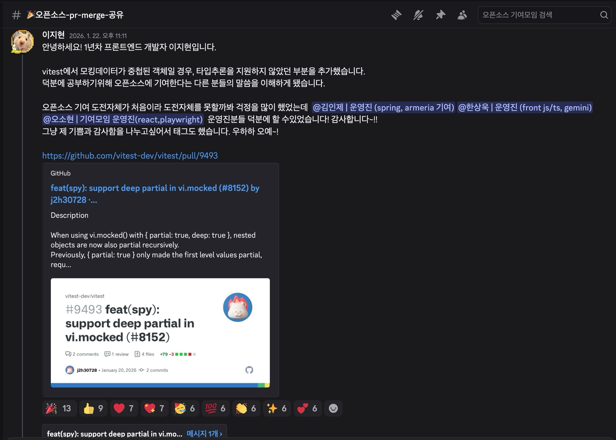 머지가 된 이후 vitest 레포지토리 홈에서 내 커밋이 보이는 것이 신기하고 기분 좋아서 캡쳐해두기도 했다.