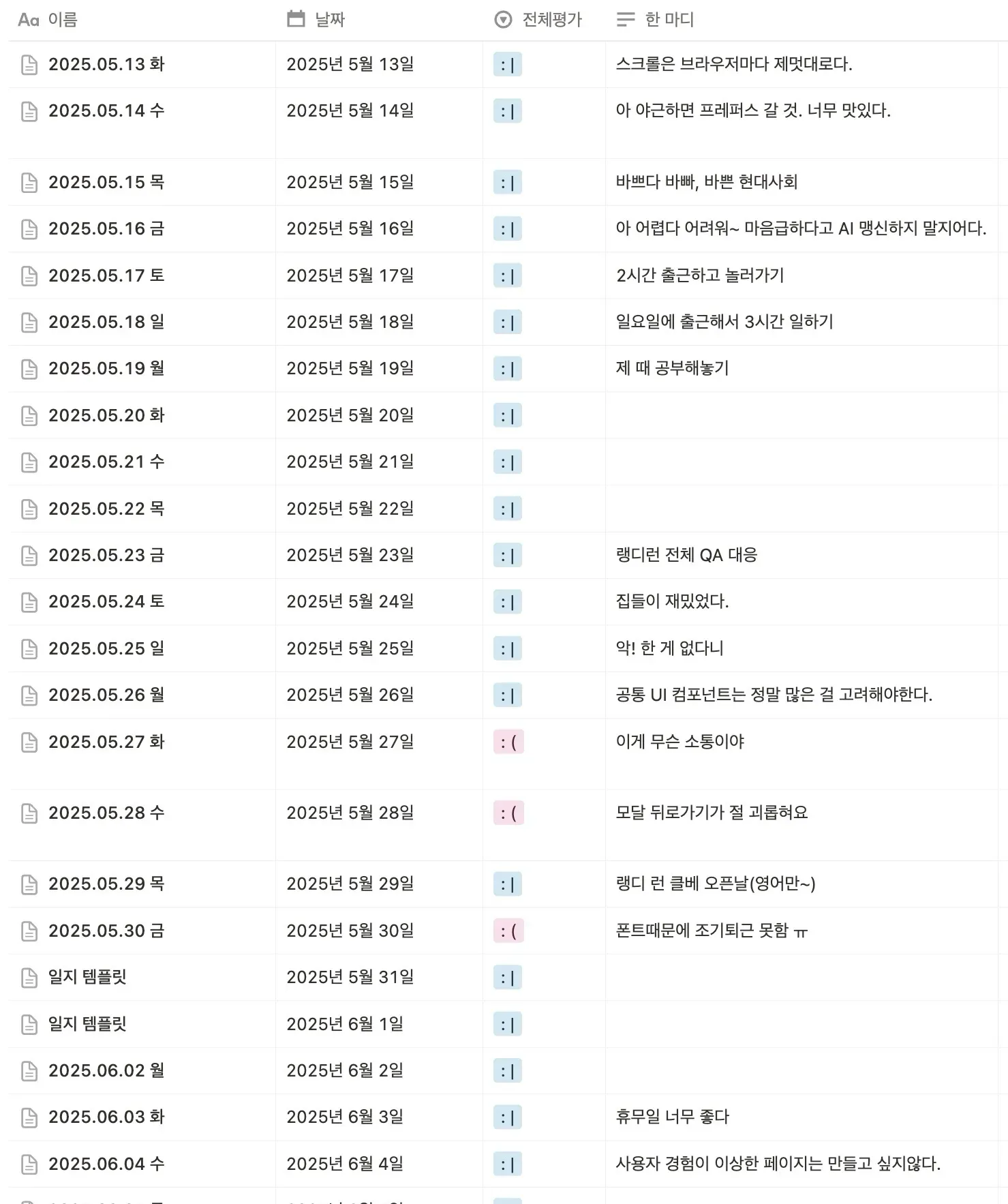 이번 회사는 할당받는 업무가 더 많기도 한 만큼 일지 작성에 심혈을 기울이지 못했다.