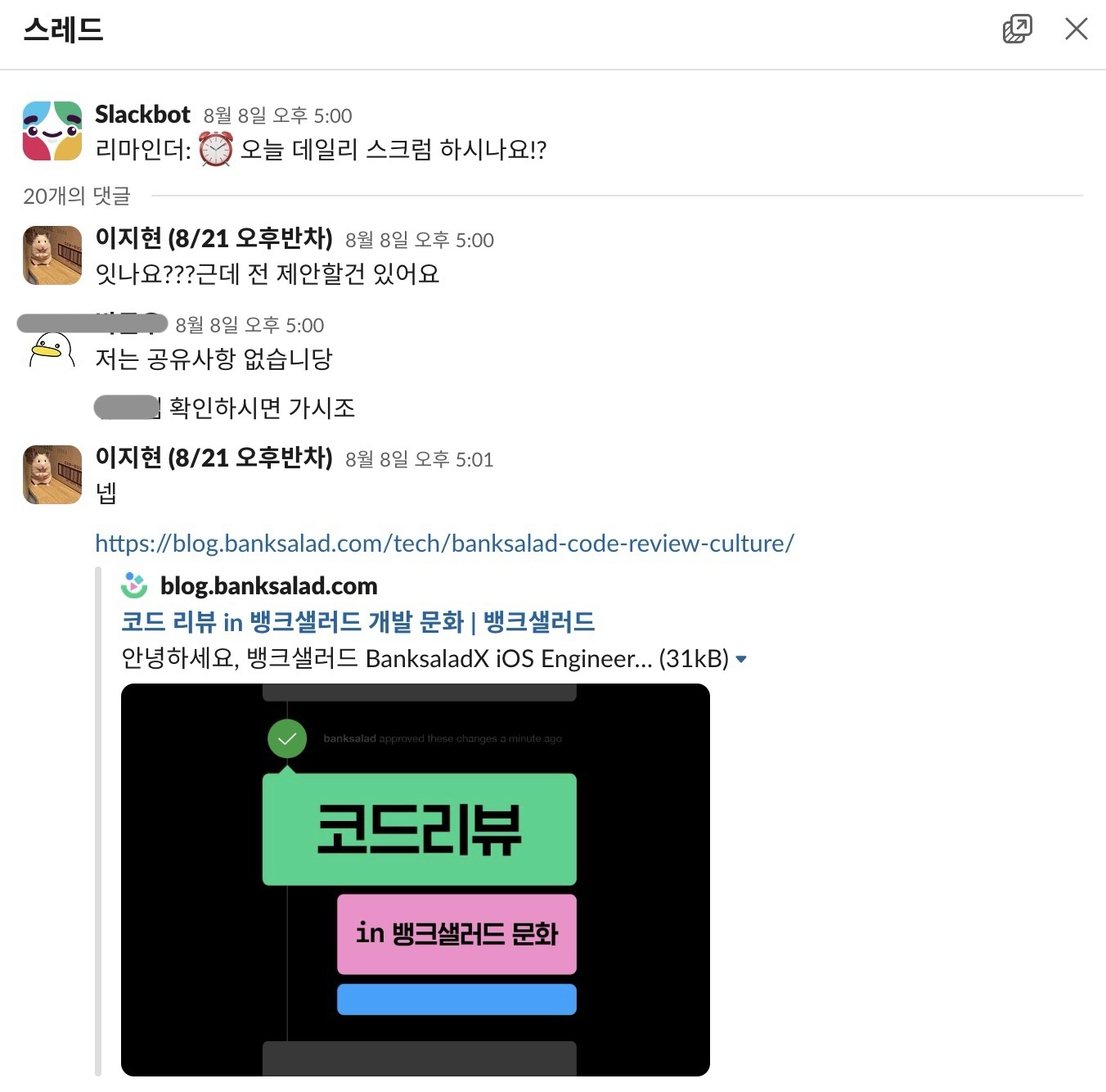 단순히 서로의 이슈를 공유하고 헬스 체크를 하거나, 더 좋은 방법을 이야기해보는 용도로 활용하고 있다.