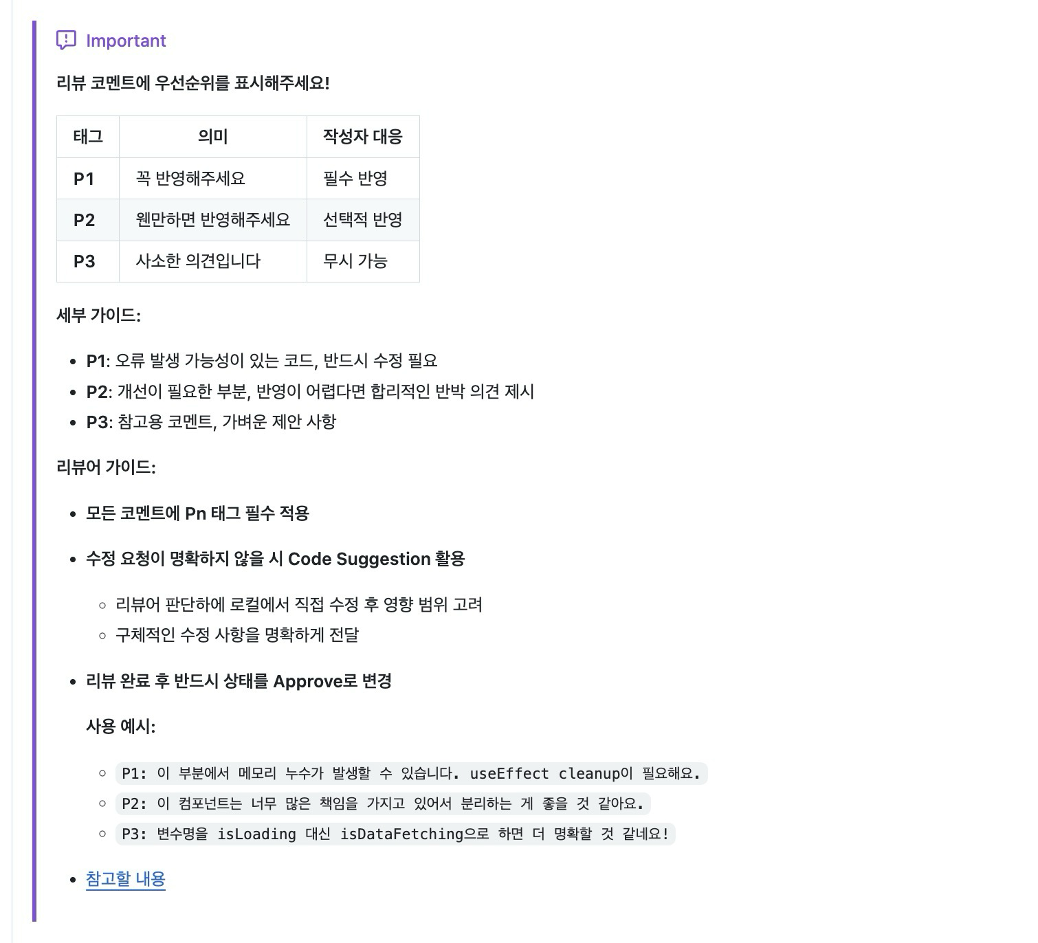 팀원의 건의로 해당 룰에 대한 설명과 예시를 PR 템플릿에 추가하기도 했다.