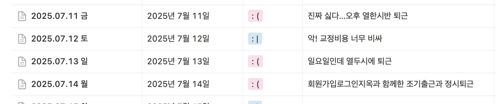 입사 한 달 후부터 하루의 내용을 한 줄로 간략히 쓰는 일지를 쓰고 있다. 원한다면 페이지 내부에 들어가서 자세하게 쓸 수 있게끔 만들어 놨다.