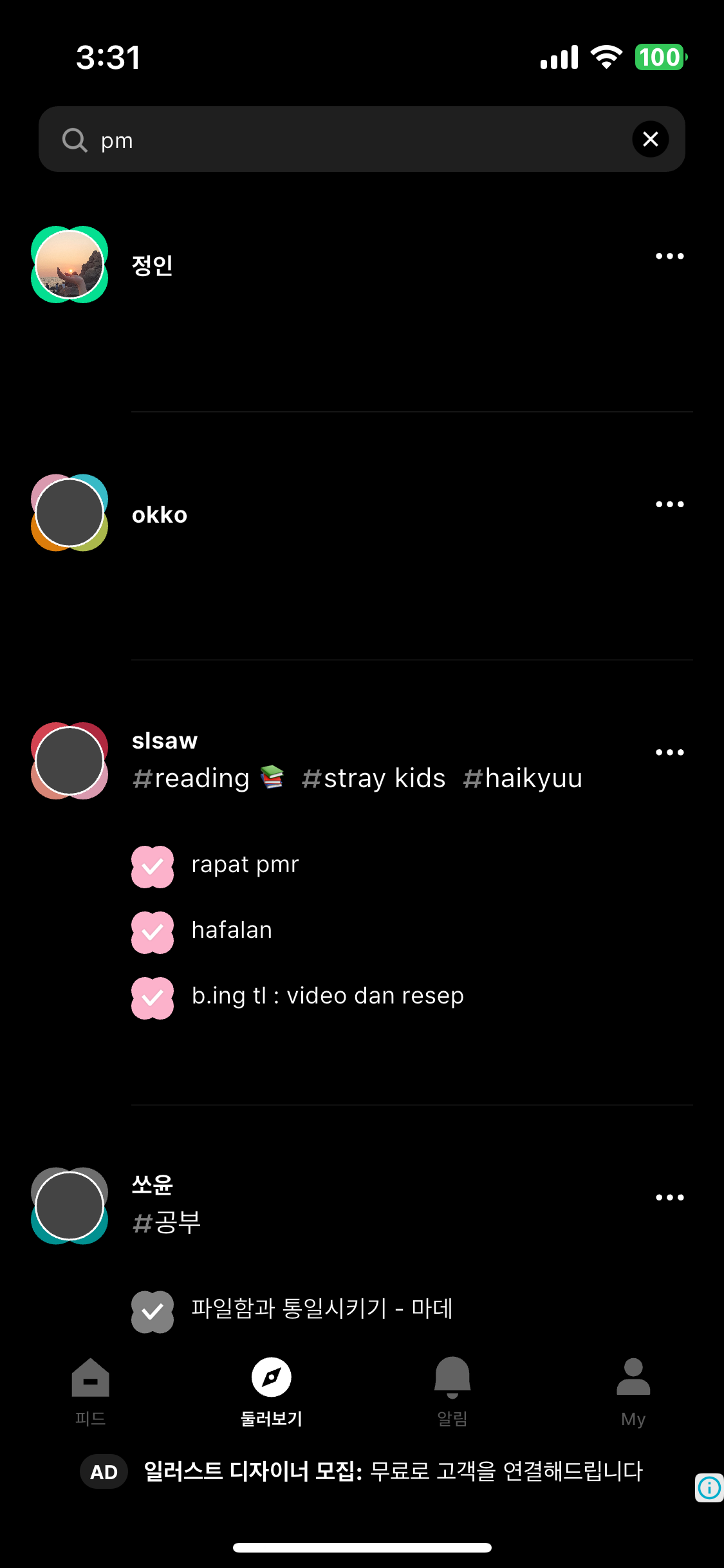 여러 사용자의 루틴과 할 일을 자유롭게 둘러볼 수 있어 다양한 사람들과 소통하거나 자극을 받을 수 있는 구조가 마련되어 있음