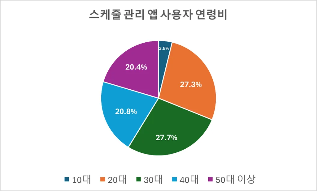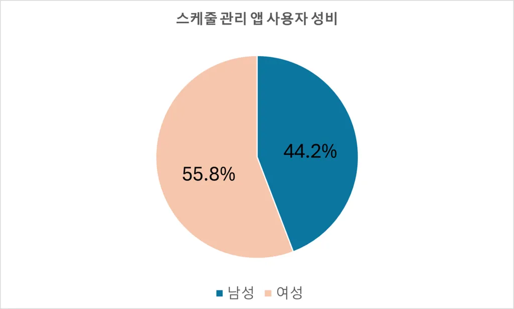 스케줄 관리 앱은 다양한 연령대에서 사용되지만, 전반적으로 여성 사용자 비율이 조금 더 높은 편입니다.