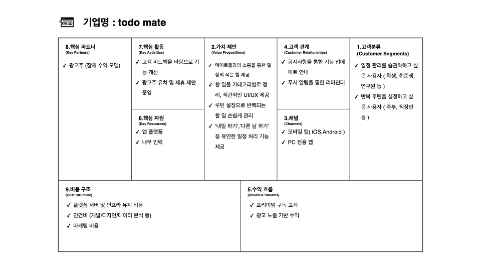 일반적인 스케줄 앱이 모든 연령대를 아우르는 반면 투두메이트는 MZ세대의 라이프스타일에 특화된 앱으로 볼 수 있습니다.