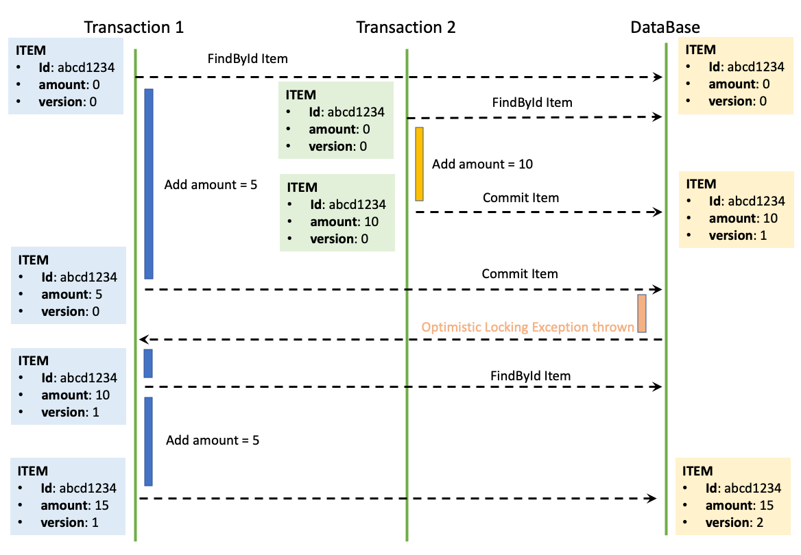 Transaction1은 예외 발생 이후 다시 Item(version1)을 읽어와 amount를 5 증가시키고 version을 1 증가시키는 UPDATE 쿼리를 보낸다