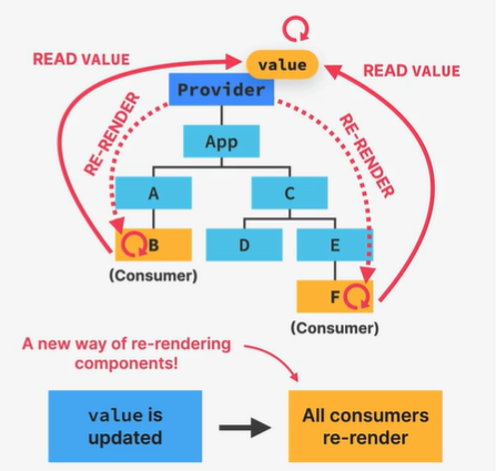 이 방식으로 Provider가 value값에 대한 access를 주면, consumer 컴포넌트들이 해당 context value를 읽고 사용하며, value 값이 바뀌면 consumer 컴포넌트들의 리렌더링이 트리거된다.