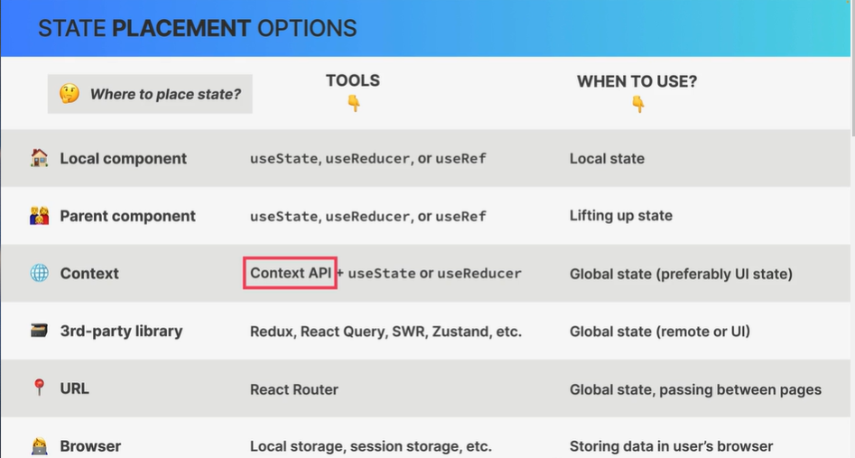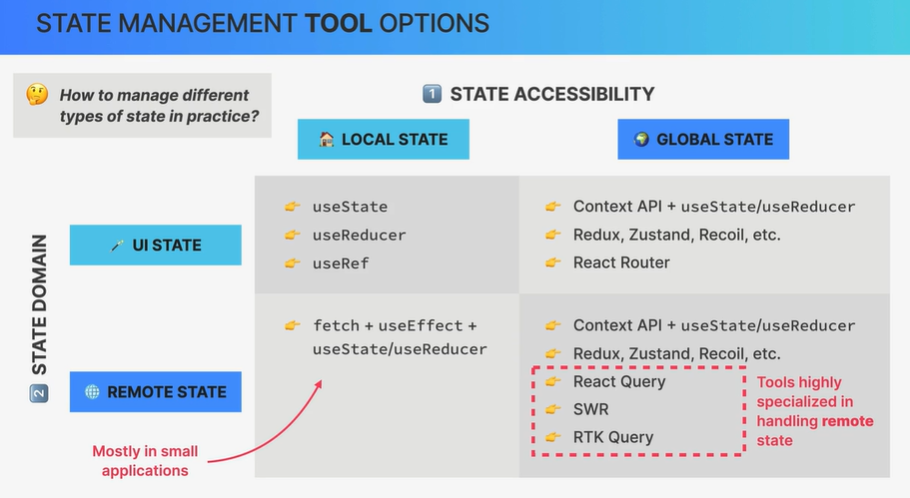 Remote state는 remote server, API같은 곳에서 로드된 데이터고, UI state는 전자를 제외한 모든 상태들이다. 이 둘의 관리 방법은 완전히 다르고, 위의 표를 참고해볼 수 있다.