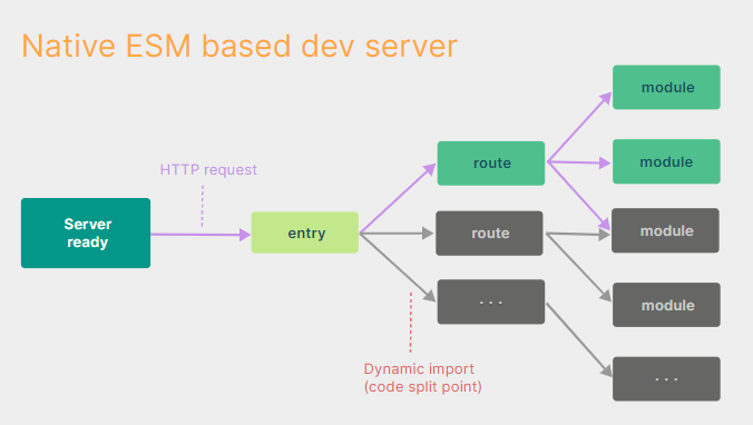 하지만 Native ESM에선 특정 모듈이 수정되면 수정된 모듈만을 교체하고, 브라우저가 요청하면 교체된걸 전달하기만 하면 되어서, HMR(Hot Module Replacement) 갱신 시간에 영향을 끼치지 않는다.