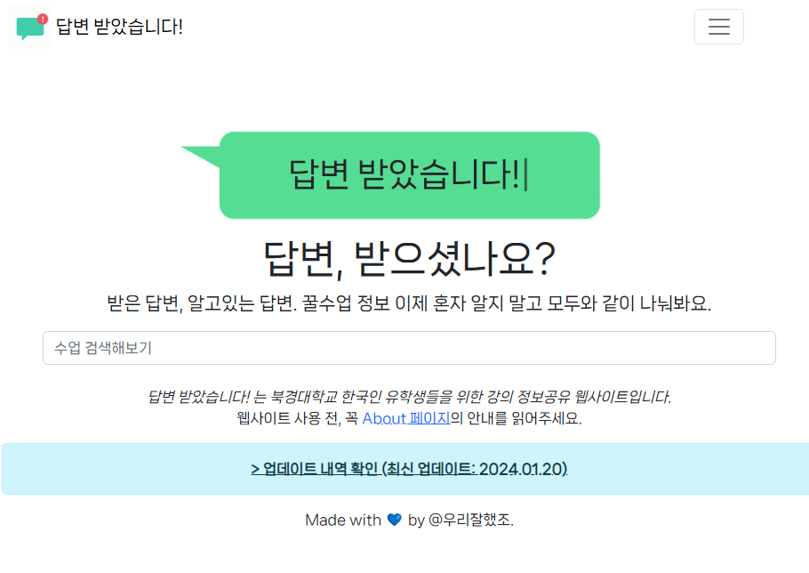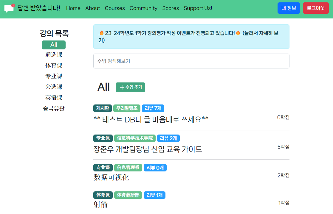답변 받았습니다! 는 북경대학교 한국인 유학생들을 위한 강의 정보공유/익명 커뮤니티 웹사이트입니다.