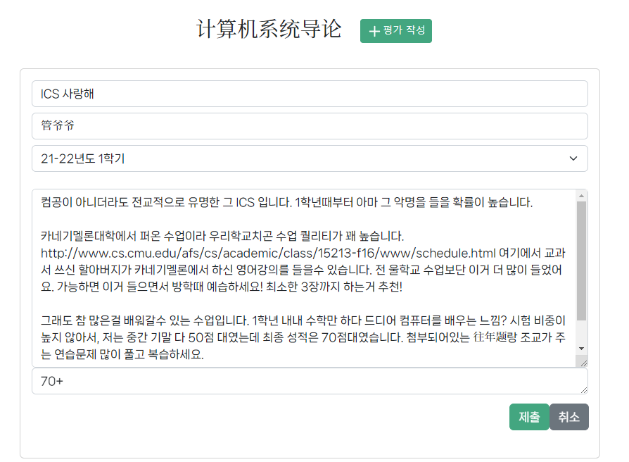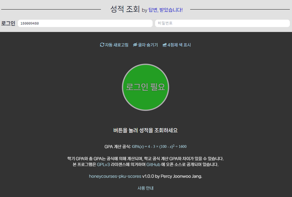 https://scores.honeycourses.com 을 통해 성적 조회를 할 수 있게 되었습니다. 사실 이 웹사이트는 제가 만든건 아니고, 해당 링크의 저희과 중국 친구가 원래 만들어둔 오픈소스 프로젝트를 가져와 한국어로 번역 및 스타일링한 작품입니다.