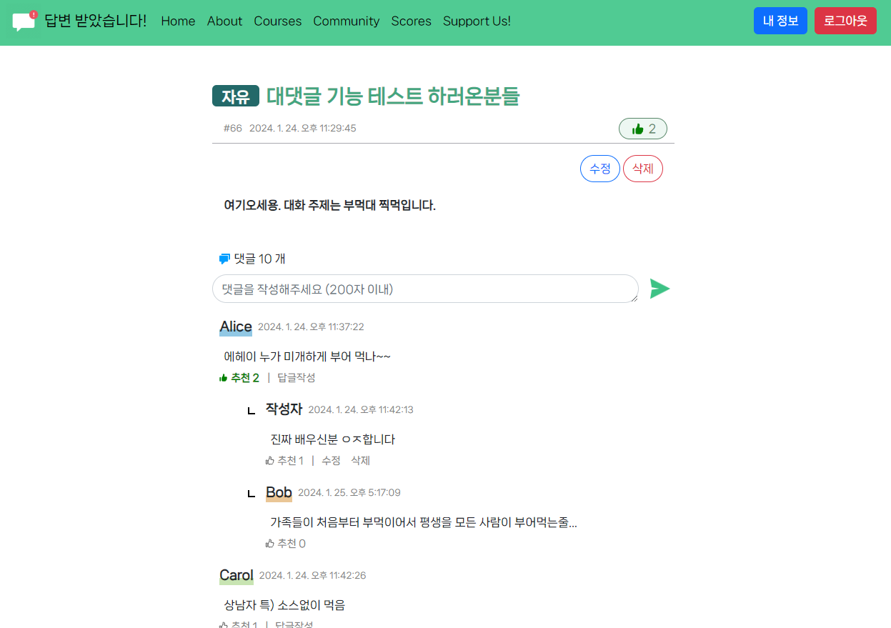 커뮤니티 기능이 베타 테스트를 거쳐서 이번에 정식 오픈했습니다! 일반 커뮤니티들처럼, 글 작성/수정/삭제, 댓글/대댓글 작성/수정/삭제가 가능한 매우 평범한 기능의 커뮤니티지만, 개발진이 가장 공들이고 시간을 많이 들인 부분이기도 합니다. 쉬워보이지만 어려워요 진짜 ㅠㅠ