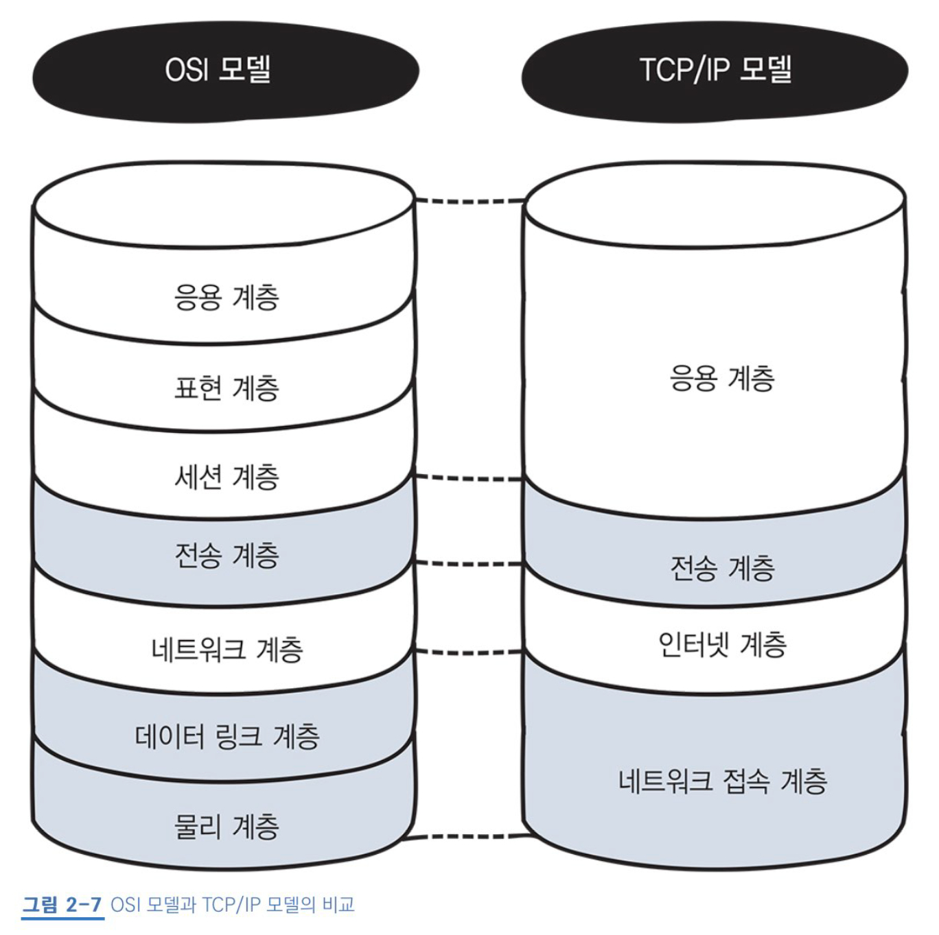 TCP/IP모델은 4계층으로 이루어져있어 그나마 덜 복잡하다. OSI 모델의 응용, 표현, 세션 계층이 응용 계층으로 합쳐져있는게 눈에 띈다.