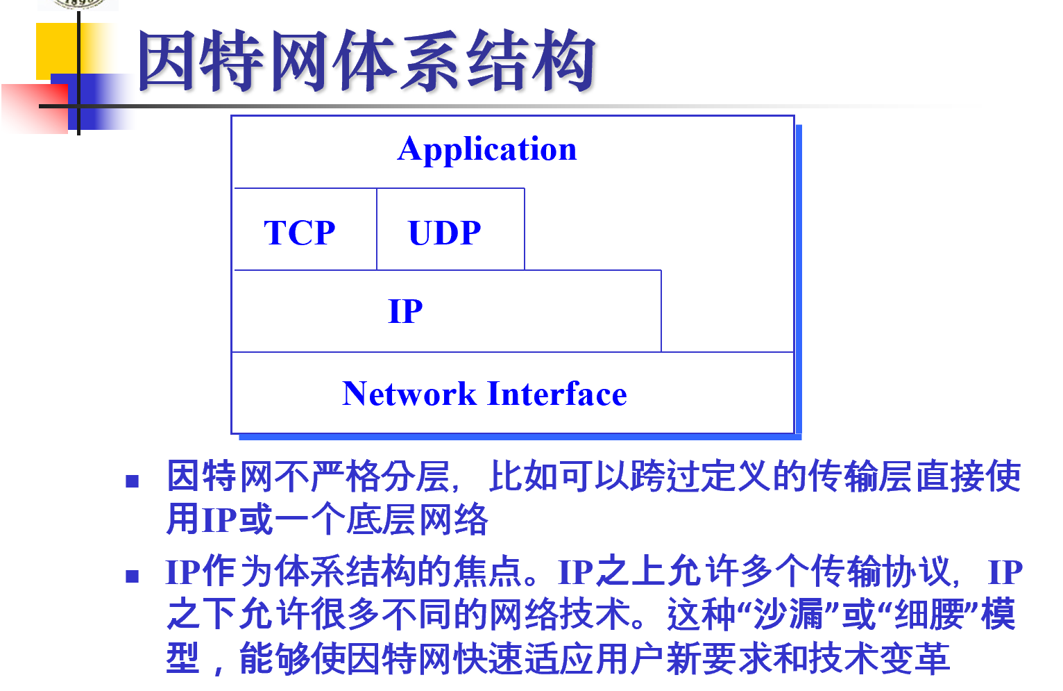 인터넷 자체는 엄격하게 층을 나누진 않는다. 하지만 IP기술이 중심이 되고, IP 위나 아래에 어떤 프로토콜/기술들이 들어올지는 자유롭기에 인터넷 발전에 큰 도움이 되고 있다.