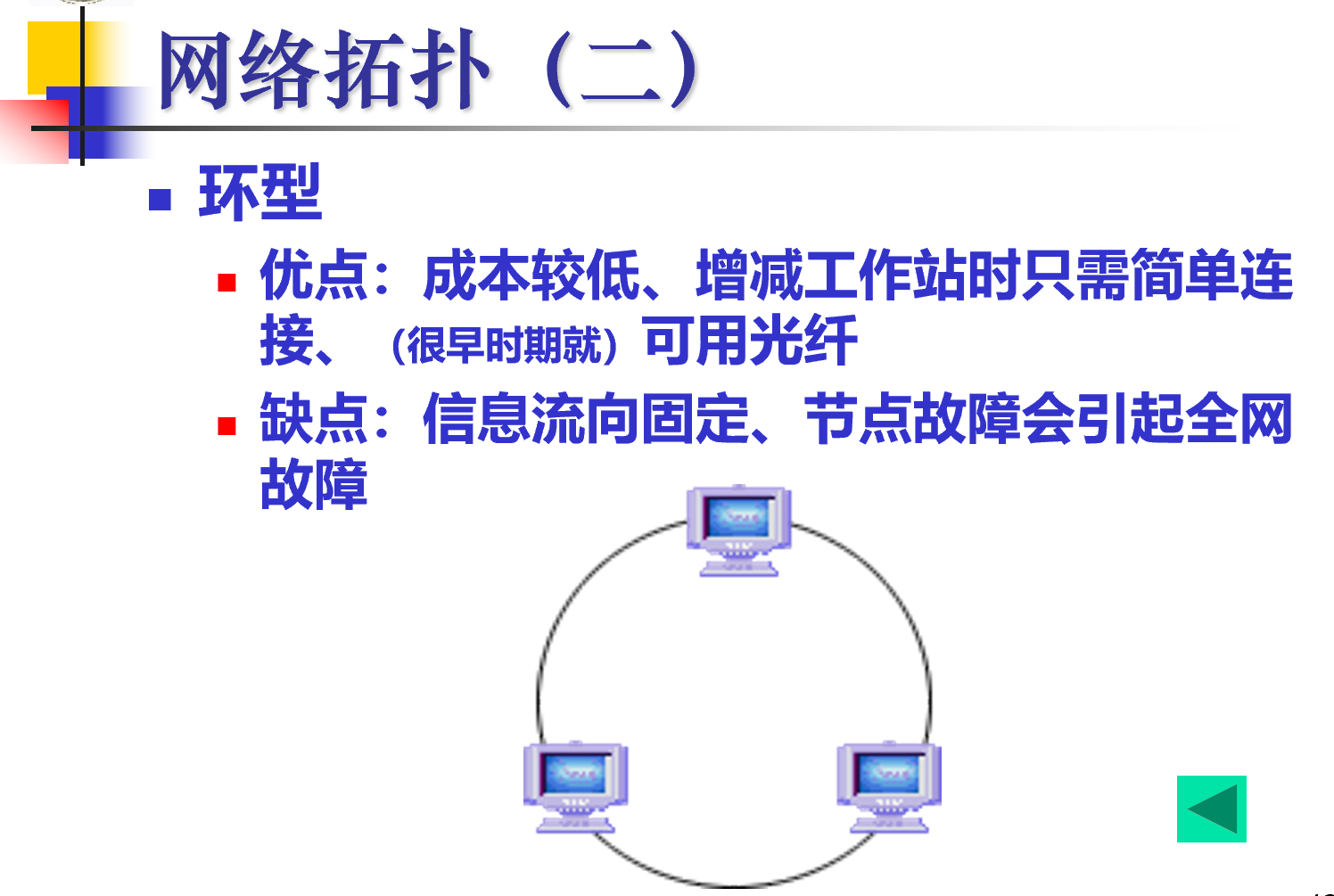 구축 비용이 비교적 낮고, 증축/감축시에도 쉽다. 하지만 노드 하나라도 고장나면 네트워크 전체가 망해버린다. 그래서 지금은 아무도 안쓴다.