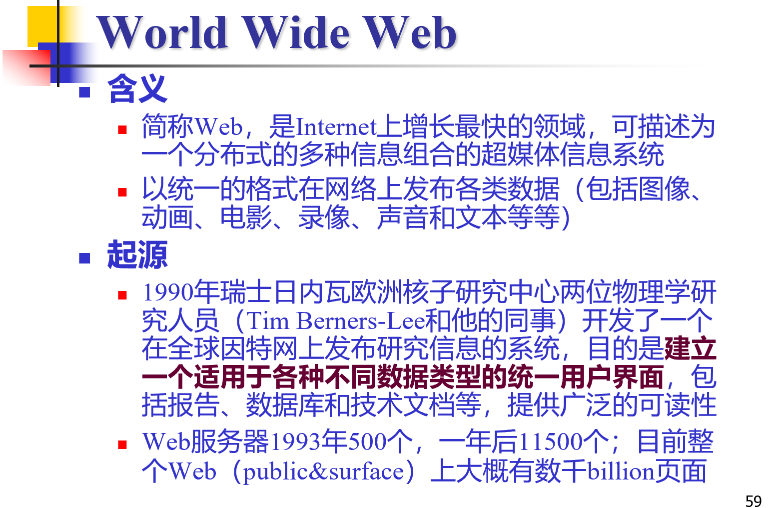 월드 와이드 웹은 분포식으로 되어있는 종합 정보가 조합된 초매체 정보 시스템 이다. 하이퍼텍스트를 중심으로 팀 버너스 리가 개발했으며, 신속한 정보 교환을 위해 만들어졌다.