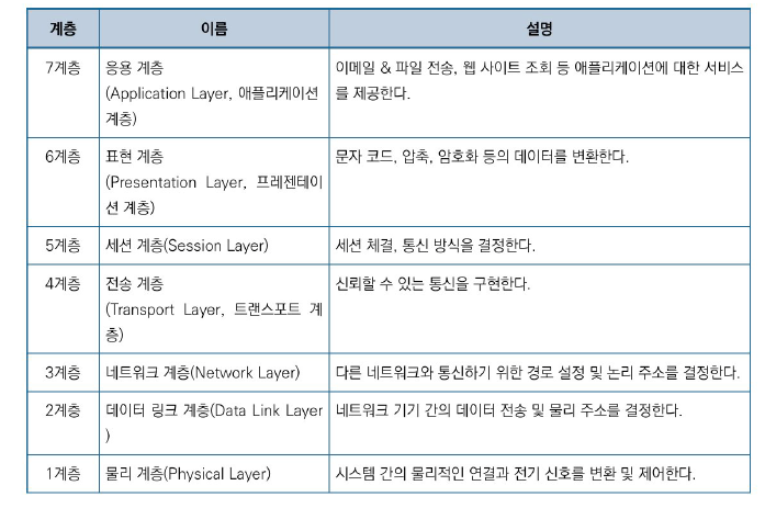 국제표준화기구(ISO)에서 개발한 모델로, 컴퓨터 네트워크 프로토콜 디자인과 통신을 계층으로 나누어 개념적으로 설명한 것이다. 매 층은 상위 계층을 위해 서비스되며, 매 층에서 활동하는 원소를 实体라고 부른다. 이중 대등한 층의 실체는 peer entity이며, 수신 컴퓨터의 n번째 층은 발송 컴퓨터의 n번째 층에서 보낸 데이터만 받을 수 있다. 즉, 대등 실체간에만 서로 데이터 발송/수신이 가능하다.