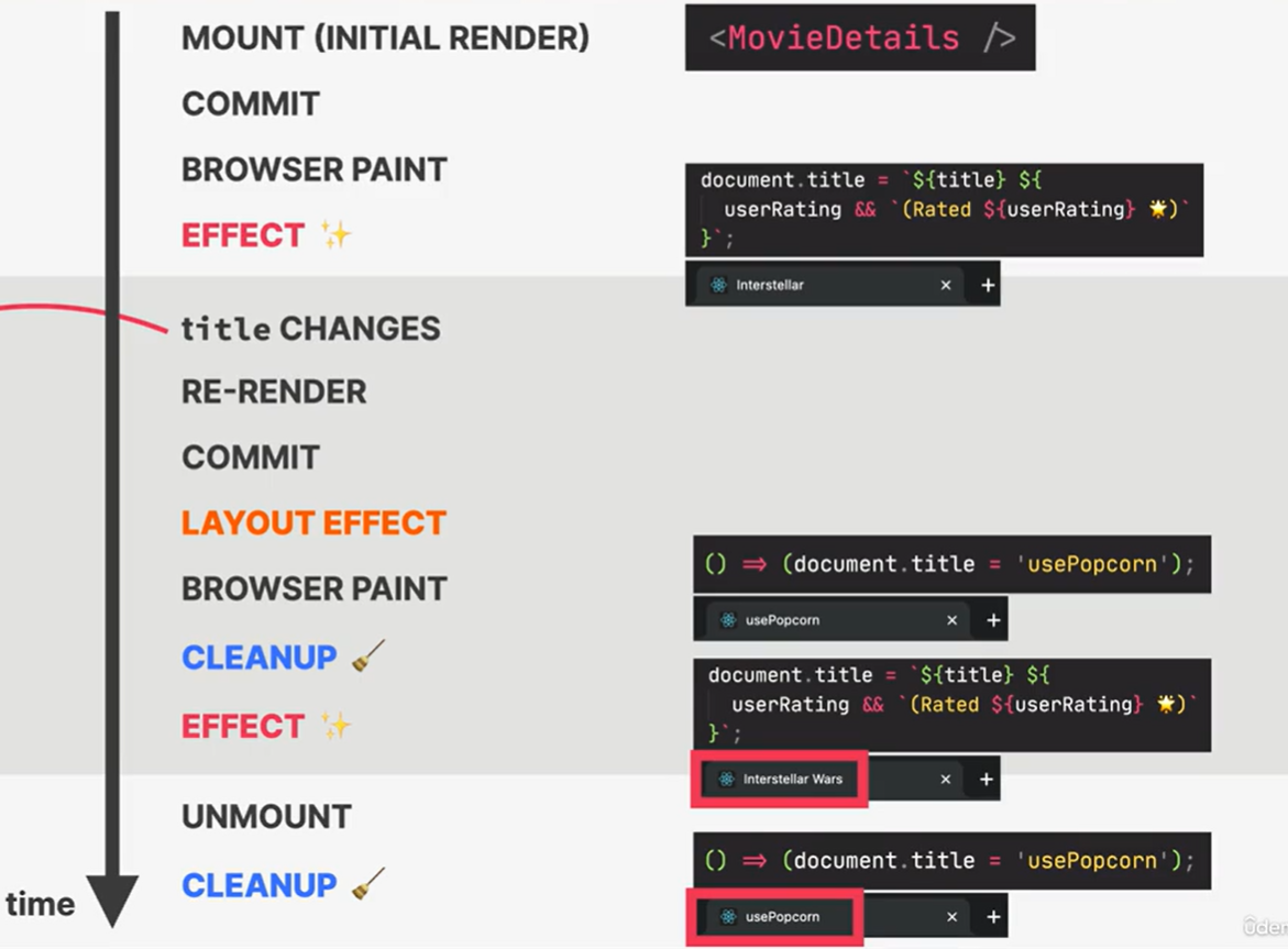 Effect는 브라우저 페인프 이후에 실행된다. cleanup은 effect 이전, unmount 이후에 실행된다.