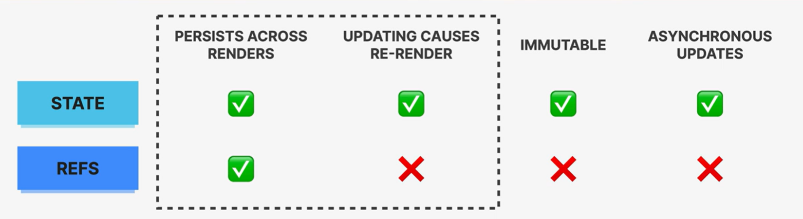 stated와의 몇가지 차이다. ref는 렌더간 유지된다는 점 외에는 모두 state와 다른 성질을 가진다. state는 재렌더링을 트리거하지만 ref는 하지 않기에, 재렌더링을 원하지 않는경우 사용하면 좋다.