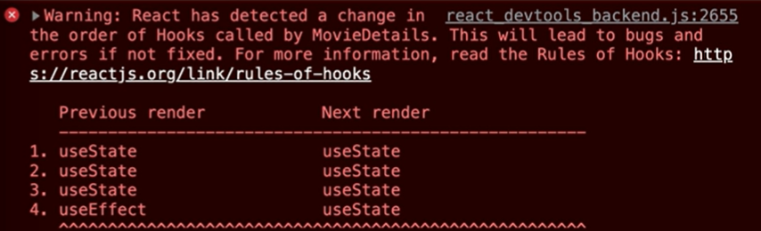 실제로 위의 룰을 어겨서 렌더때 hook 실행의 순서에 변경이 있거나, 실행되는 hook의 갯수에 변경이 있으면 프로그램이 바로 뻗어버린다.