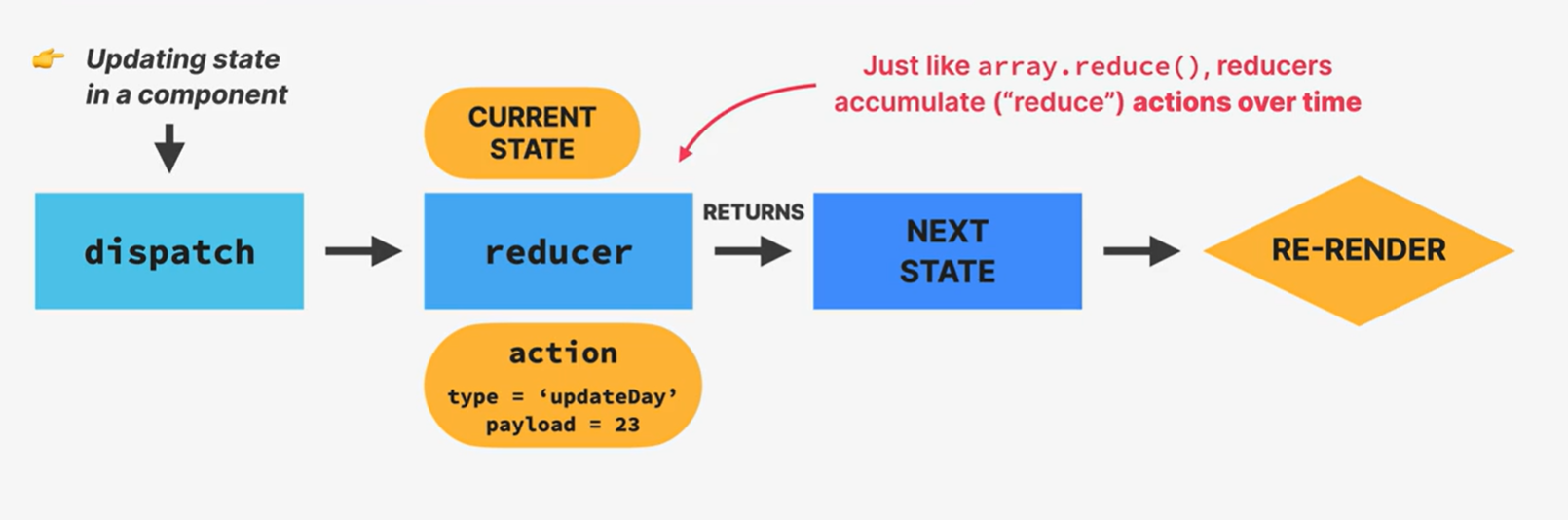 Reducer는 pure한 함수고, state와 action을 인자로 받아 다음 state를 반환한다. action은 state를 업데이트 하는 방법을 알려주는 객체다. 최종적으로 dispatch 함수를 setState함수처럼 사용해 reducer로 action을 보내서 state update를 트리거한다. 최종적으로 re-render가 트리거된다.