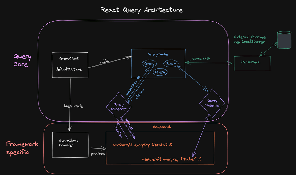 쿼리들은 쿼리에 대한 정보 뿐만 아니라 쿼리 함수, 재시도 등 정보도 포함중이다. 쿼리는 변경된다면 해당 변경사항들에 Subscribe된 Observer들에게 알려진다. Context API가 생각나는 부분이다.