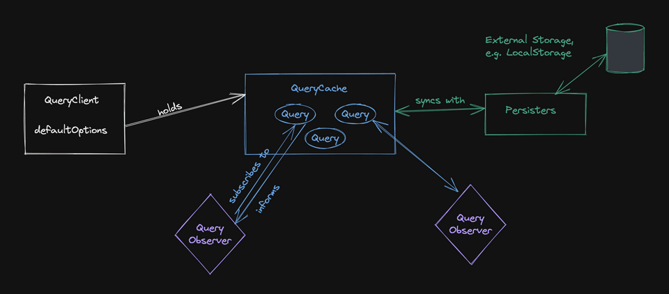 우선 App 루트에 적용한 QueryClient가 핵심이다. 이는 QueryCache와 MutationCache의 컨테이너고, 쿼리와 뮤테이션들의 기본 설정값들을 보관한다. 보통 캐시와 직접 상호작용 할 일은 없고, QueryClient를 통해서 한다.