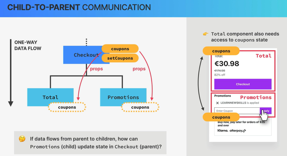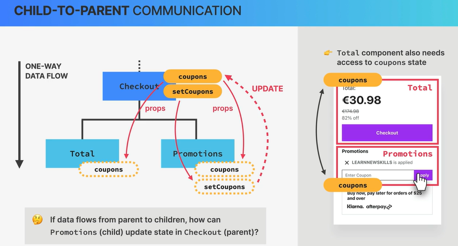 위 예시에선 coupons 상태가 하위 2개 자식 컴포넌트들에게도 사용되어야 하여서 상위 컴포넌트로 lift-up되었다. 하지만 반대로 이제 Promotions 컴포넌트에서 쿠폰코드를 업데이트해서 상위 컴포넌트의 상태를 업데이트해야 한다면 어떻게 해야할까?