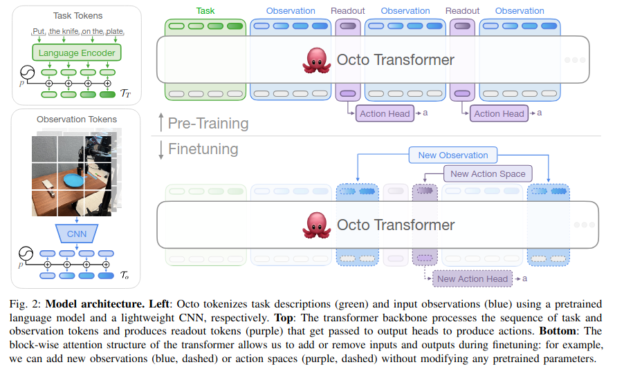 Octo model은 flexibility랑 scale을 강조한다. 또, diffusion decoding으로 자연어 명령어, 목표 이미지, observation history와 멀티모달을 제공한다. 새로운 robot에도 효율적인 finetuning을 할 수 있게끔 한다.