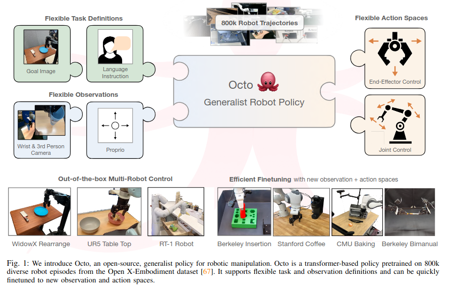 Octo는 Open X-Embodiment에서 수집한 80만개 trajectory로 학습된 대형 transformer 기반 policy model이다. Octo는 자연어 명령이나 목표 이미지를 통해 지시를 받을 수 있으며, finetuning도 효과적으로 할 수 있다. 9종의 로봇 플랫폼을 대상으로 한 실험에서, 서로 다른 환경에서도 finetuning할 수 있는 policy initialization이 된다.